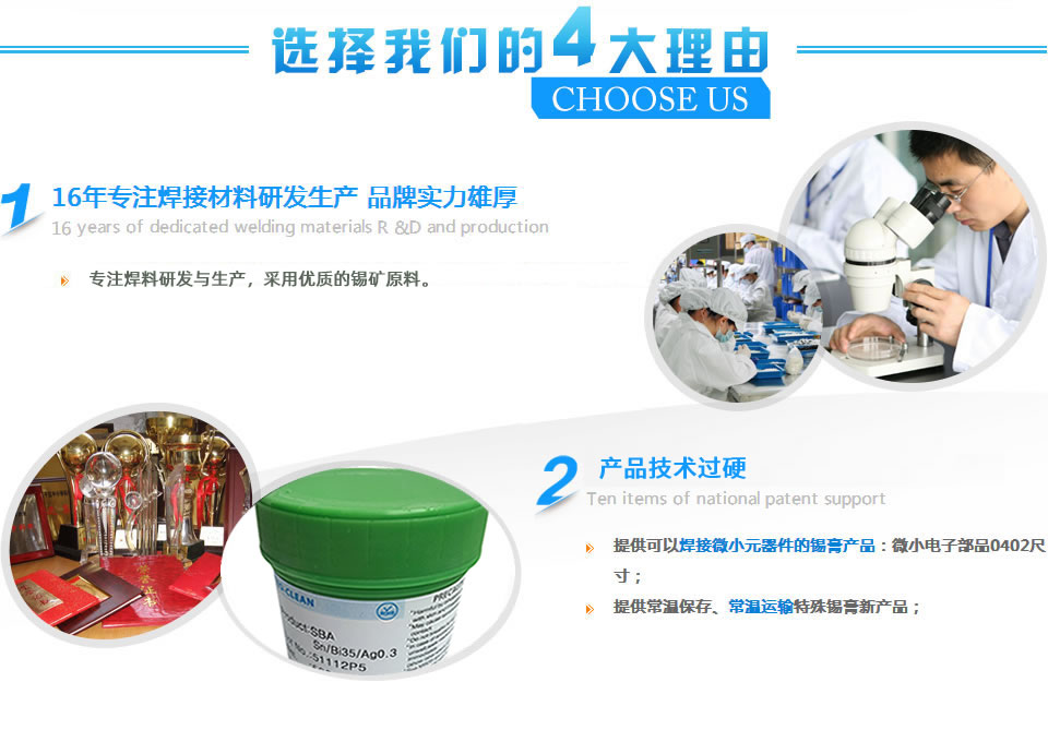 江蘇博藍錫威金屬科技有限公司是一家集研發,生產及銷售為一體新能源公司,主要經營:錫膏、焊錫片、焊錫絲、焊錫條、紅膠、日本千住確信愛法電子輔料系列產品。 采用全自動化的生產設備檢測儀器進行生產和檢驗檢測,工程技術人員團隊從事電子焊接材料、錫膏、助焊劑的生產研究已達多年,并長期得到國內焊錫材料、錫膏、助焊劑方面的老專家的授藝和指導。無論是理論基礎、 生產工藝還是管理均在同行業處于較高水平。